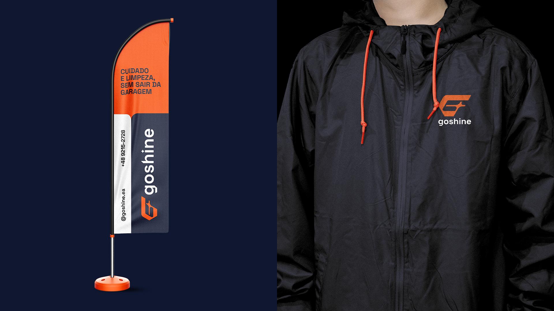 O nome “Goshine” une dinamismo e brilho – essência da proposta empresa e visualmente a marca combina um símbolo baseado na letra G com cortes angulados e um brilho que representam movimento.